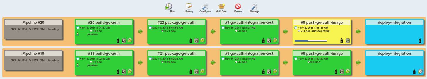 像上篇文章中提到的,我们将使用git-flow分支模型来合并所有的分支到“develop”分支。 为了实现持续部署,我们需要一个简单到机制来基于最新到develop分支构建镜像。 在我们的打包任务中,我们用“GO_AUTH_VERSION”给容器打上标签(如:docker build -t usman/go-auth:${GO_AUTH_VERSION} …)。 默认情况下,版本为develop,然而,文章后续我们将为应用创建新的release,并进行构建、打包、发布、测试、部署到集成环境。 注意:这种情况下总是会构建最新的镜像而覆盖原有的历史版本,从而无法进行恢复和回滚。 你可以使用一个简单的改变,就是使用构建序号来标识版本,比如:usman/go-auth:develop-14。